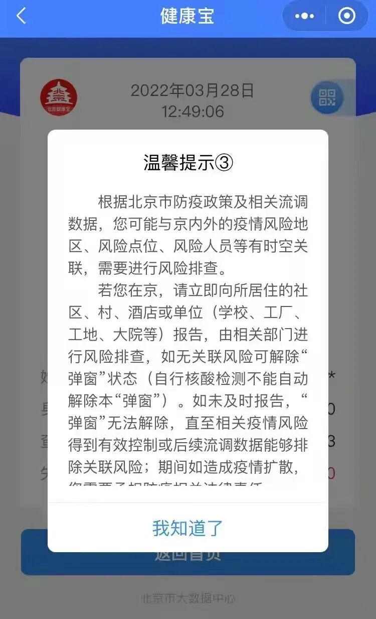 工作人员:如果说他一直在北京,出现弹窗后联系在京居住地的社区,向社区报备一下这个弹窗的问题,听社区的要求。如果让他做核酸的话,还是要做一个,做完之后再联系社区,社区把他的情况进行上报,职能部门去复核一下他的一些行程,要确保他没有风险之后会把弹窗给他解除。