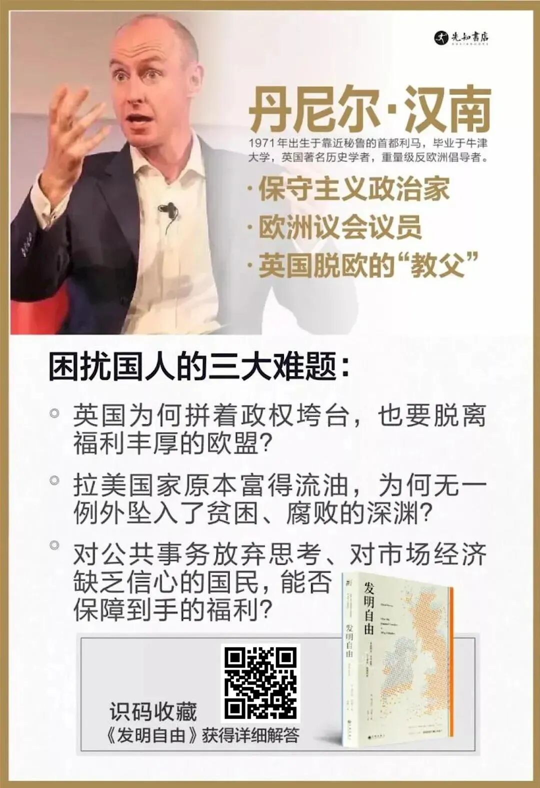 自由与其说是“西方的”、毋宁说是“英国的”独特发明。选举议会、人身保护令、契约自由、法律面前人人平等,以及开放的市场、改变宗教信仰的自由……以上种种,皆是英语民族对世界政治意识形态所做出的独特贡献——用英国著名历史学者、政治家丹尼尔·汉南的话说,这是“盎格鲁圈的奇迹”。现在流行提问“我是谁、从哪里来、到哪里去”,丹尼尔·汉南的《发明自由》一书可视为对这三个问题的回答。自由不分国界,英国人的答案,对我们来说也同样极具价值:盎格鲁圈,即指受英国自由价值观影响的、讲英语的国家和地区,前身都是英国的殖民地,核心是英、美、澳大利亚、加拿大和新西兰。汉南认为,盎格鲁圈的国家,经济、社会发展水平明显高于全球其他地区,为什么属于盎格鲁圈的英国、美国能长期保持国际领导地位?为什么这个圈中的国家能占据大半个世界的几乎所有的制高点?自由是英语民族成功的秘密,随着自由阵营赢得了二战这场宏大战争的胜利,自由已经成为现代人集体潜意识的一部分。然而,放眼当下,欧债危机、贸易阴影、极端组织兴起、中东局势一触即发、……世界并没有变得更好。这是否就意味着“自由的失败”?英语民族的“成功药”再也不灵了吗?脱欧并不是简单的黑天鹅事件,脱欧的公投结果植根于英国根深蒂固的传统理念之中,在汉南看来没理由为一个不切实际的理想与越来越官僚化的欧盟同床异梦……为什么英国人并不把自己视为欧洲人?为什么英国与欧陆国家结合是一种错误的政治选择,不能让欧洲变得更好,反而让英国变得更糟?为此,新少数派联合先知书店诚挚推荐丹尼尔·汉南《发明自由》一书,这是一本关于盎格鲁-撒克逊文化圈缺失已久的作品,它将带领我们重新探索这段发明自由的旅程,启迪我们思考应如何面对未来。在全球化的时代,观念融合,文化交汇,人类总是有趋同的一面。自由的基因永远潜藏在每个人的心里,所有的例外,终将汇成滚滚巨流,奔向自由的海洋,识别下图二维码,即可收藏本书。