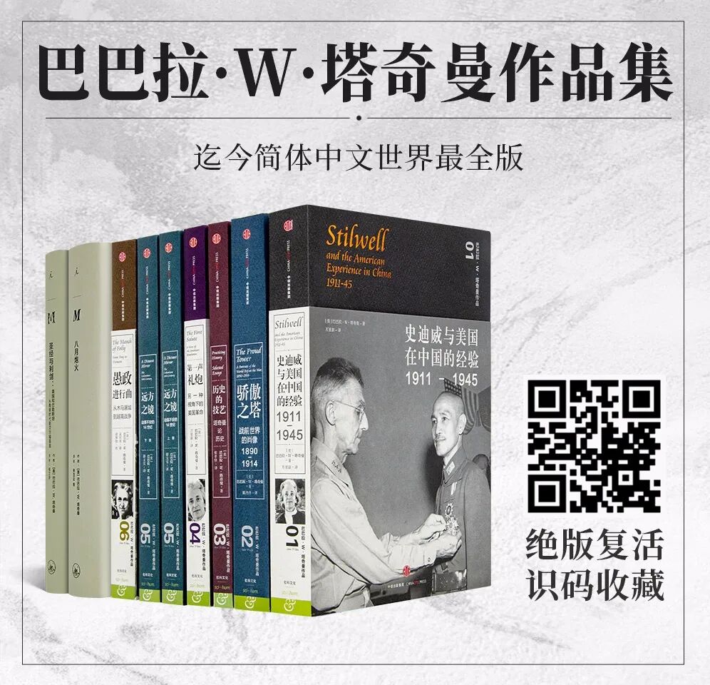 天才的作品,一千个读者,就有一千种体验——阅读塔奇曼,是在体验阅读之美的同时,完成一场智慧之旅。以《远方之镜》为例,这本书的写作,源于塔奇曼在整理文献时意外发现的宝藏:一位14世纪法国贵族的传奇人生,令人心驰神往,又扼腕叹息,其精彩程度,丝毫不亚于金庸的武侠小说,更引人入胜的是,这些故事,竟然全都是真的。让人不得不叹服,现实的精彩远远超出人的想象力。这些故事,因为塔奇曼的历史技艺,让读者品味到了“比金庸武侠还精彩的真实人生”。更巧妙的是,此人的经历,恰好完美印证了现代文明的三大挑战:内部动荡和价值观的崩溃、外部世界的侵略威胁、大瘟疫过后的逆势崛起。除了阅读的享受、智慧的魅力,在知识过剩、信息泛滥的今天,读塔奇曼,需要一种“焚香沐浴为读书”的仪式感。因为她的文字,有一种挑逗阅读者不得不涂划、玩味、品鉴的魔力。这是任何为了高效获取信息和知识的碎片化阅读、电子阅读所无法代替的。作为政治家外交活动的国礼,塔奇曼的书,当然也是我们馈赠亲友的上上之选。因为它不只是一套经典,更是一个关于智慧、审美、品质、品位的符号。遗憾的是,塔奇曼的作品在中国被长期被忽视。她的部分作品引入国内后,曾一度绝版。为此,先知书店携手塔奇曼作品的出版方,复活了《史迪威与美国在中国的经验》《骄傲之塔:战前世界的肖像》等六部作品,并与近两年出版/再版的《圣经与利剑》《八月炮火》组成“塔奇曼作品集”,一共八卷,迄今简体中文世界最全版。点击下图或识别二维码,可一键收藏,或在规格中选购最感兴趣的塔奇曼作品。(也可在京东、淘宝搜索“塔奇曼 先知书店”,收藏正版好书)![]()