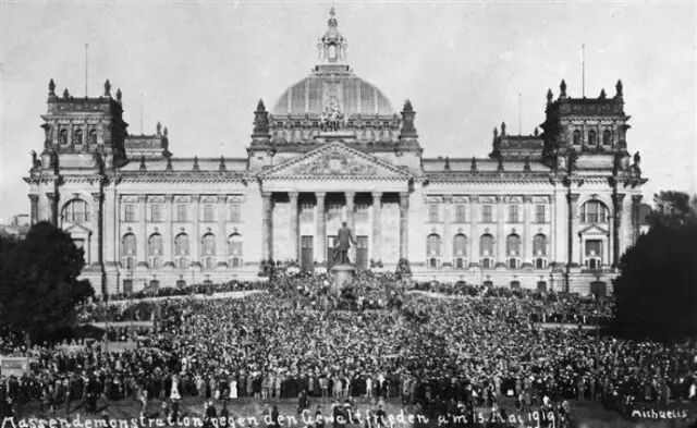▲ 国会大厦前抗议凡尔赛和约的德国民众,1919年