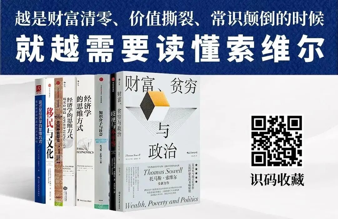 越是这样的时候,我们就越是需要一位深谙经济学思维与真实世界运营逻辑的思想家与他卓越的智慧。如今已经90高龄的黑人思想家索维尔,从源头——即知识分子的观念如何发挥影响力的角度。深刻批判了那些满脑子“善良意图”的政客、知识分子,也为被这些宣传冲昏头脑的大众,开出了一张思想领域的“黑名单”。因此,无论东方还是西方,索维尔的作品对现实社会,都具有巨大的价值。他看到了这个时代的弊病,看到了无数不负责任的政客和知识分子的谎言。他用事实和一个个的小故事讲出被扭曲的真理,针对普通民众的常识启蒙,让人们看清事物的本质,区分什么是“坏思想”,从而避免社会重蹈覆辙。为此,先知书店诚挚推荐“索维尔作品集”(含绝版、独家),包含最新出版的《这才是经济学的思维方式》,越是价值撕裂、财富清零的时候,我们就越需要读读索维尔,识别下图二维码,即可一键收藏。