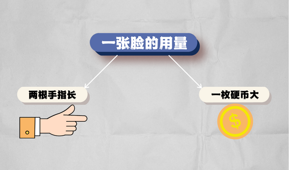 第一种方法,伸出两根手指,在手指上挤上“两条”防晒霜,就是一张脸大概的用量了;第二种方法,挤出一个圆形,大小和一枚1元硬币相当。
