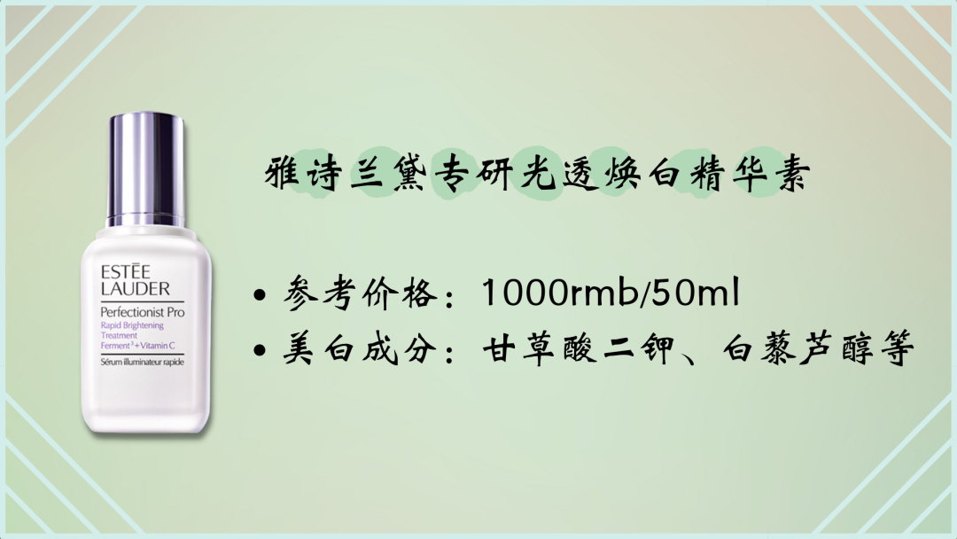 雅诗兰黛的这款美白精华也是它家的匠心之作,不过为了保证美白效果,主要的美白成分是白藜芦醇、酵母提取物和AA2G,而甘草酸二钾主要作为辅助,帮忙舒缓皮肤中的炎性因子,既达到美白的效果,又不会让皮肤过于刺激,特别适合皮肤敏感的人。同时甘草酸二钾自身也参与美白,再次加固美白淡斑的效果,所以从结果而言,这款精华的美白实力毋庸置疑。
