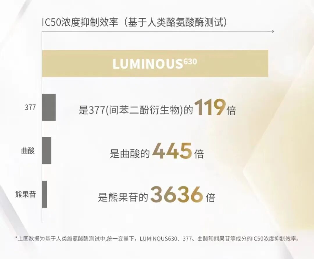 百炼成钢的LUMINOUS630,主要作用在色素和色斑上,通过“逮捕”酪氨酸酶这一源头,减少色素的产生,从而减少色素沉着。和类似成分相比,LUMINOUS630的工作效率可谓一骑绝尘。随便举个例子,根据实验结论表明,和大家熟悉的美白成分377相比,LUMINOUS630仅需它的百分之一浓度即可达到同等抑制效果,低浓度也有大效果!