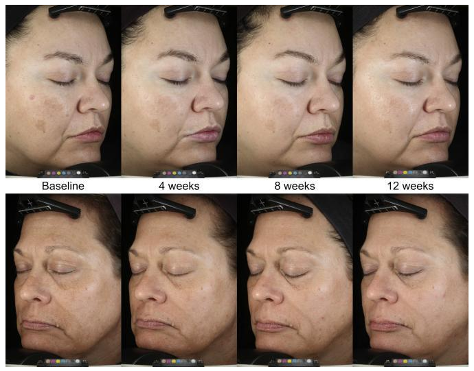 在对成分配方的精益求精之下,使用效果自然也不是盖的,直接拿到实验室的真实数据说话。根据上图可见,经过12周的使用,受试者的色斑明显淡化,肤色也白净了不少,这效果,惊了!