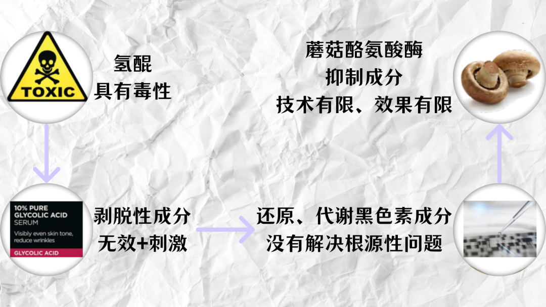 最初和酪氨酸酶掰头(对抗)的是氢醌,高风险高回报,自带毒性,一不小心过头反而会促生色斑,现今已基本退出护肤市场。接着登场的是剥脱性成分,通俗来说就是“刷酸”老废角质细胞确实被压制了,但烦人的色斑依旧让它束手无策,而且操作不好还容易给自己“换张脸”,敏感肌可要退避三舍。然后是一些可以还原/代谢色素的成分,忽略了酪氨酸酶这个根源性问题,结果还是不尽如人意。这时候,科学家们开始转换思路,但由于技术限制,大家只能基于蘑菇内含有的酪氨酸酶进行研究,寻找对策。遗憾的是,蘑菇不等于人啊,成分效果还是差了点意思,出来的产品在真人使用效果这一趴与期望值相差甚远......