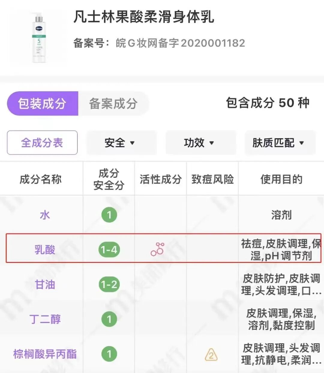 凡士林5号精华身体乳便是其中的佼佼者,选的是对身体角质问题很有一套的乳酸,且位列成分配方里的第二位,含量到位,效果自然十分突出。并且,凡士林还把乳酸浓度提到5.5%,既不会超过国家乳酸浓度用量的标注,又能最大程度地保证使用效果。5.5浓度的乳酸,比起它的“同行”水杨酸更温和,一边和肌肤亲密贴贴,一边和鸡皮、肌肤粗糙打对抗,让你的肌肤如滑滑梯一般光滑。