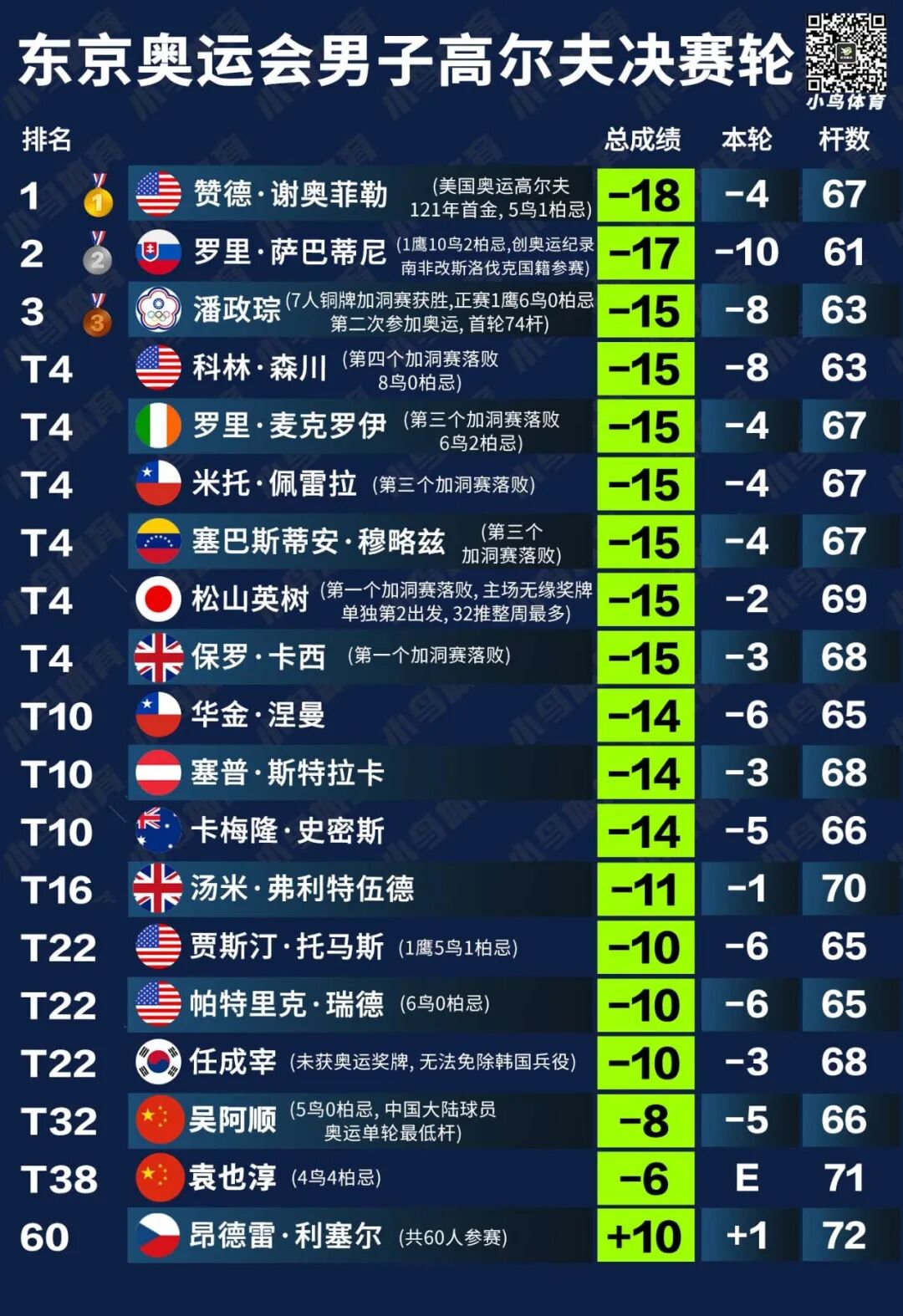 值得一提的是,本届奥运会最后43洞,吴阿顺只吞下1记柏忌,抓下了12只小鸟!尤其是决赛日,他打出了5鸟0柏忌的66杆,不仅超越了他自己与冯珊珊共同保持的中国大陆球员奥运单轮最低杆数纪录 (67) ,还交出了中国大陆选手在奥运历史上第一张bogey-free的“完美记分卡”!