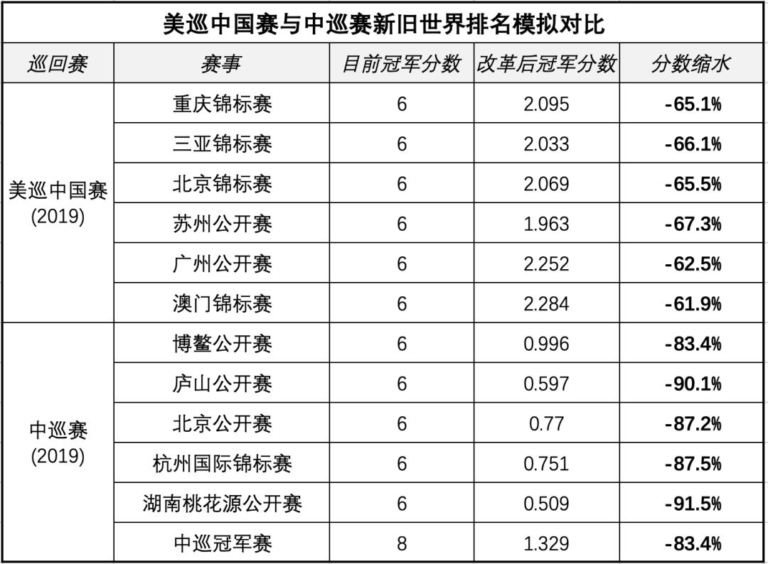 由上图可见,哪怕是同等级巡回赛,也没有像中巡赛那样,世界排名积分暴跌90%之多……