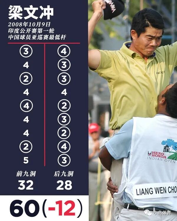 中国人在海外巡回赛上的单轮最低杆,发生在十四年前的印度。2008年印度公开赛第一轮,梁文冲以亚巡赛奖金王身份,在德里高尔夫俱乐部飚出了一张60杆的记分卡,震惊世界。