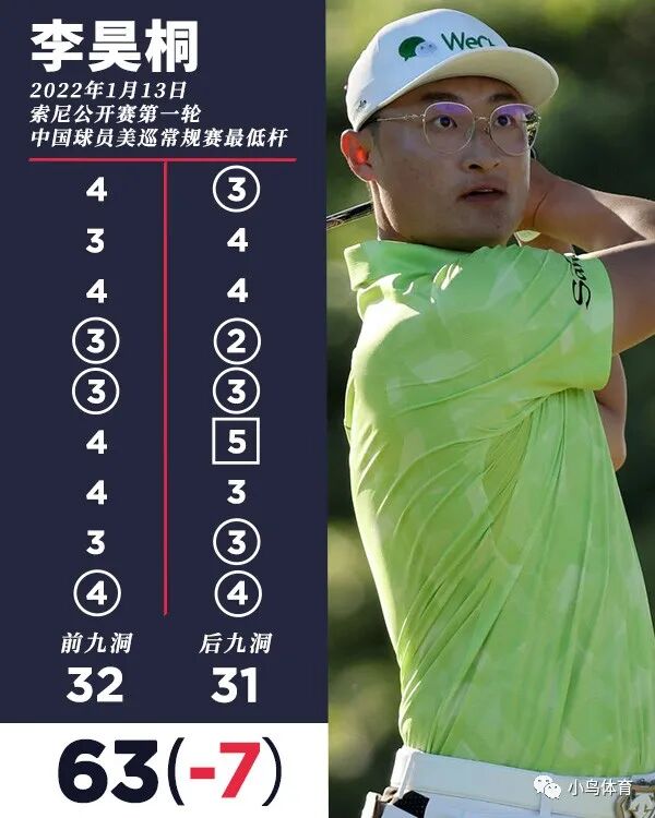 持外卡第2次亮相索尼公开赛,李昊桐在2022年首秀戴上了一副框架眼镜,也迎来了久违的小宇宙爆发——首轮比赛,他抓到8只小鸟,只吞下1个柏忌,打出了低于标准杆7杆的63杆,冲至这场美巡新年首场全阵容赛事的并列第4名。