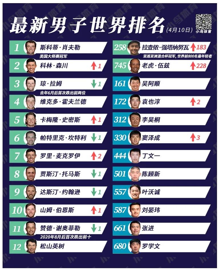 不过在今年农历春节的凤凰城公开赛上,肖夫勒加洞赛一举扳倒另一位“稳定男”联邦杯总冠军坎特利,终于在自己的第71场美巡赛中打破“冠军荒”!随后他就像突然破解“夺冠密码”一样,在3月的帕尔默邀请赛和世锦赛-比洞赛上再下两胜,短短42天便从世界前十冲至世界第一,超越了老虎·伍兹历史最快纪录,荣登世界排名史上第34任“球王”!