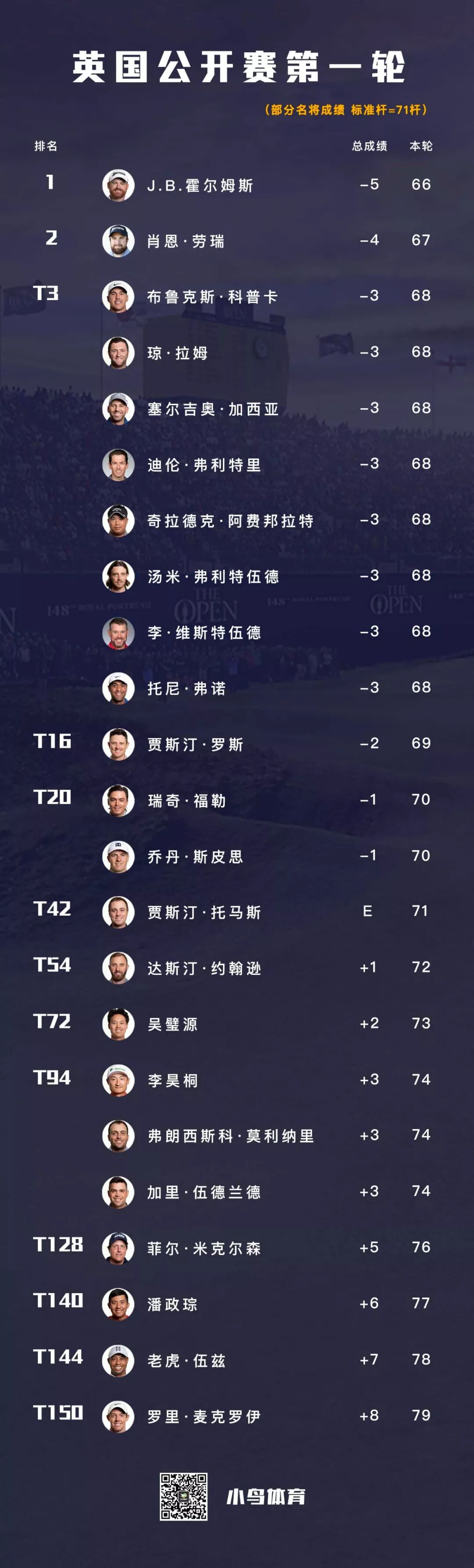 李昊桐全天抓下3只小鸟,却也吞下了6记柏忌,高于标准杆3杆的74杆,是他三次参加英国公开赛的最差开局。他的开球上球道率 (57.14%) 和标准杆上果岭率 (44.44%) 都不理想,唯有果岭上的27推,让中国一哥守住了并列第97位的排名。李昊桐说,他要在第二轮为冲上晋级线全力以赴。