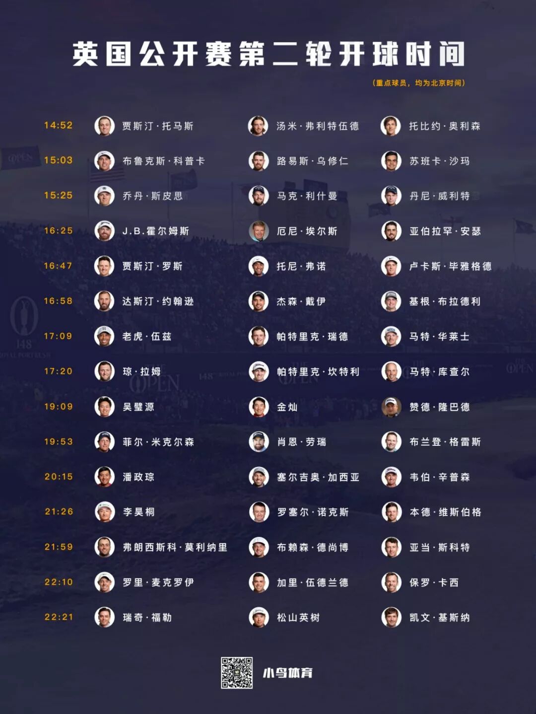 今晚,第148届英国公开赛将第二日角逐。首秀不甚理想的李昊桐、老虎·伍兹、罗里·麦克罗伊等名将都要为晋级做殊死一搏!次轮具体开球时间如下: