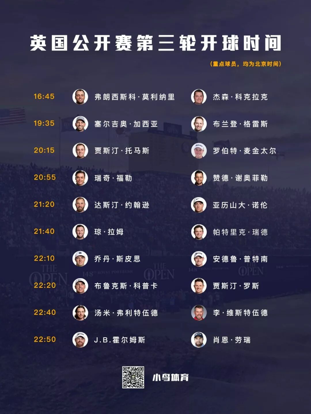 今晚,第148届英国公开赛将进行第三轮“移动日”的角逐。劳瑞和霍尔姆斯将在领先组同组出发,科普卡、罗斯、弗利特伍德、维斯特伍德、斯皮思等强豪也在对葡萄酒壶奖杯虎视眈眈。第三轮名将具体分组和开球时间如下: