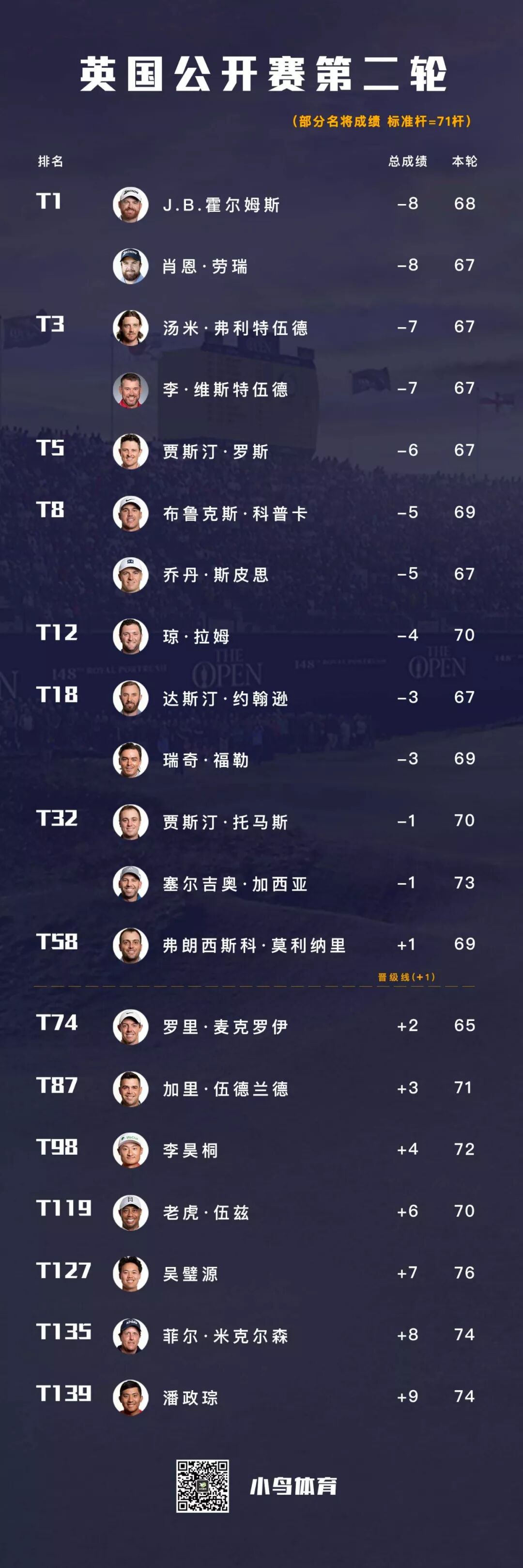 小麦全场狂抓7只小鸟,仅在PAR3的13号洞,吞下当日唯一一记柏忌——但就是这记柏忌,以及首轮79杆的巨大劣势,让他最终功亏一篑,一杆之差无缘周末决赛。这是继2013年之后,他第二次在英国公开赛淘汰出局。尽管未能晋级,小麦还是受到了现场数万名北爱老乡的掌声鼓励,虽败犹荣!