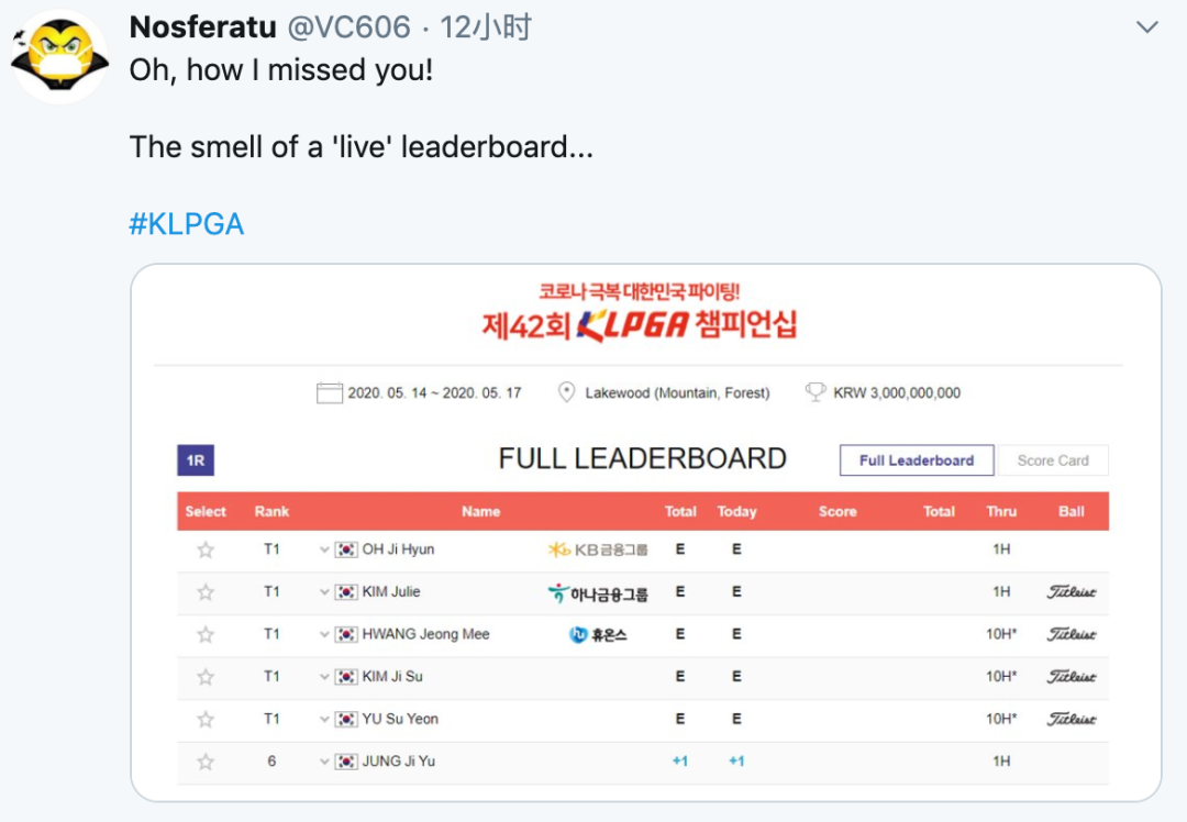 高尔夫数据大神Nosferatu为韩巡赛复工喜大普奔