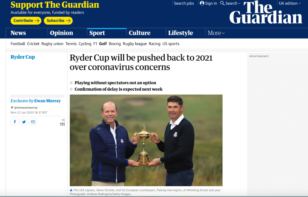 受到疫情影响的,还有2020年的众多体育赛事——从东京奥运会、足球欧洲杯,到高尔夫大满贯级别的英国公开赛和依云锦标赛,都已经纷纷延期或取消。而在北京时间今晨,英国《卫报》更是爆出一条震撼新闻:今年莱德杯将延期一年举行!