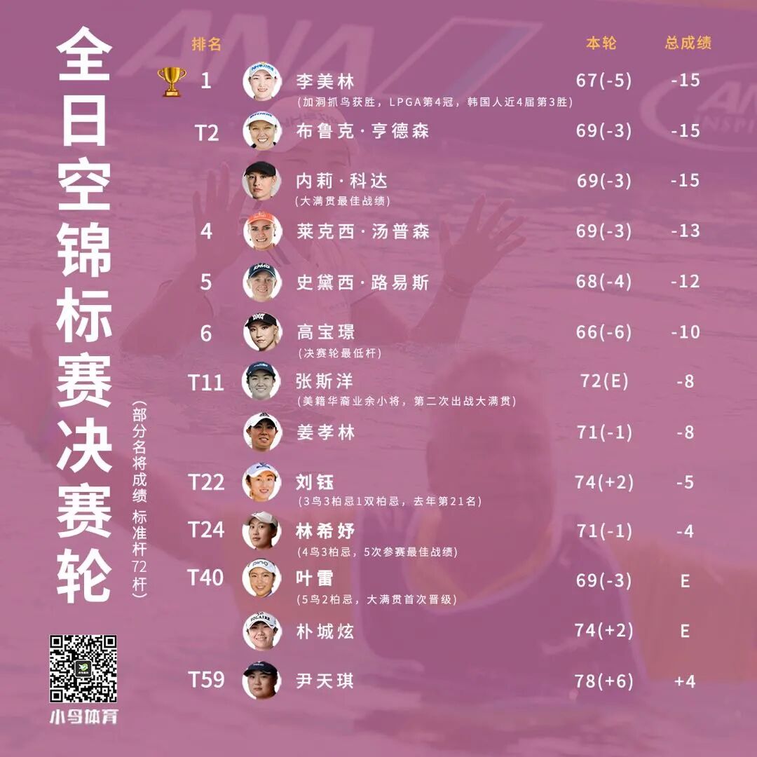 对于张斯洋目前取得的成就,皮内尔说他并不感到特别惊讶:“我知道这女孩可以做到什么。她有一些东西是与生俱来的,是你没法指导的。如果落后领先者3杆,她总是在寻找机会如何实现突破,咬住对手最终逆袭反胜1杆。她就是能做到这一切,这是一个真正的斗士。”