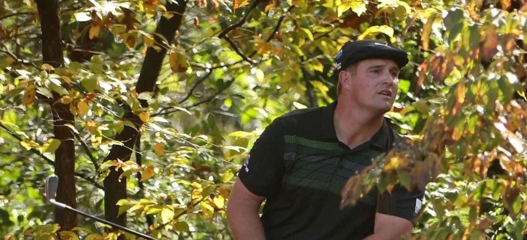 没错!因为吹牛败了人品的,正是布赖森·德尚博!后九出发的他,不仅没能上演用一号木轰炸小鸟的好戏,反而在510码的13号洞遇到了大麻烦:他的开球打出slice,直接飞到了球道外的树林之中……