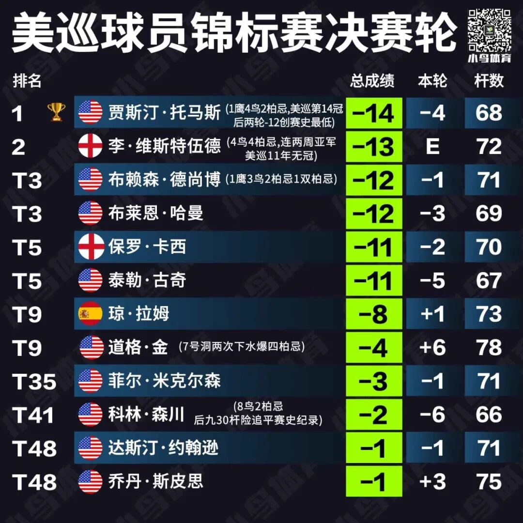 前两轮仅打出71杆的托马斯,在周末的两天猛然苏醒:移动日飚出64杆之后,决赛轮,在领先组的维斯特伍德和德尚博同时陷入低迷的关键时刻,JT转场前后四洞内及时爆发,打出1鹰3鸟的完美冲击波,一举登上领先;尽管14号洞三推吞下柏忌,但16号洞两上两推的关键小鸟,让他最终以1杆优势力压领先出发的维斯特伍德,获得了生涯第14座美巡赛冠军。