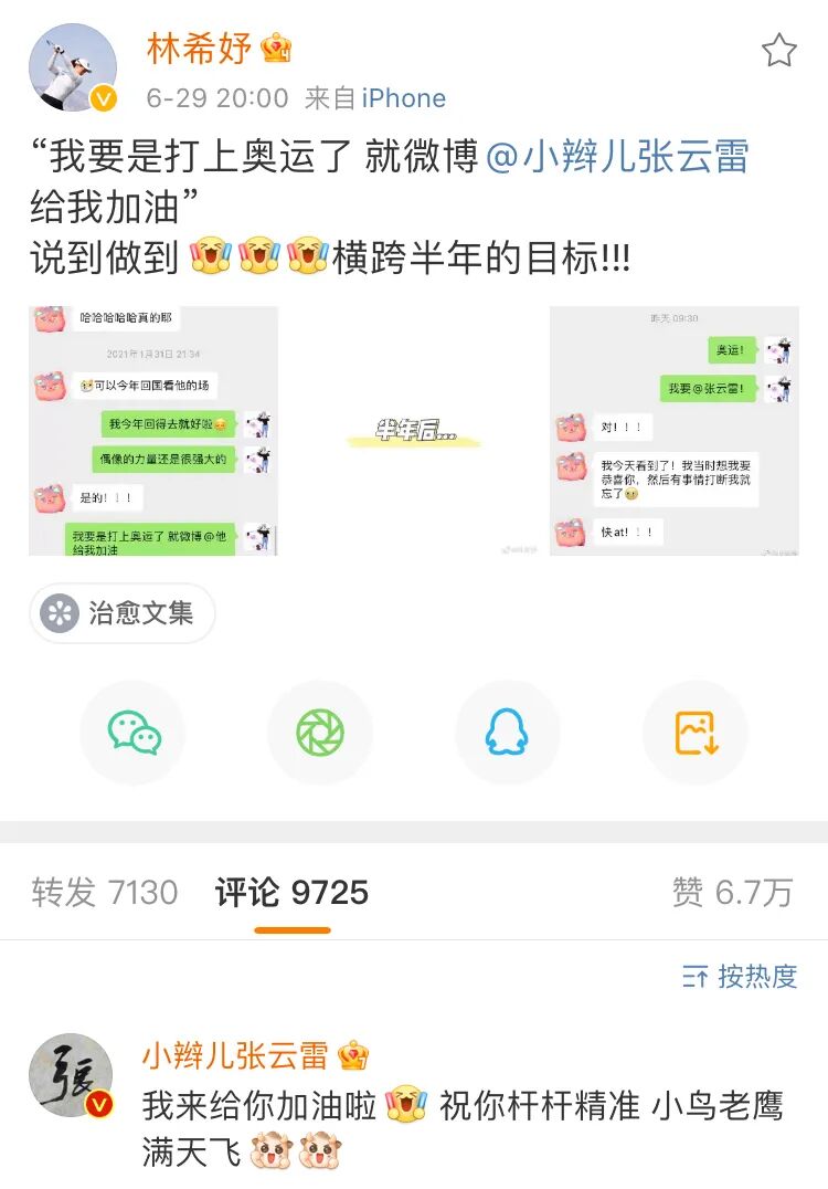 当天她还说:“偶像的力量是很强大的。”同时许下心愿——自己如果能打上奥运会,就在微博上艾特张云雷给她加油。差不多小半年过去了,上月底亚特兰大举行的女子PGA锦标赛,林希妤一举斩获大满贯第9名,在东京奥运女子高尔夫入围截止日的当天,确保了奥运席位到手!心想事成的她,在6月29日的微博上,晒出了当初与朋友的聊天记录截图,豪情写道:“说到做到,横跨半年的目标!”并且,“如约”艾特了张云雷。令人惊讶的是,张云雷本尊真的回复了!6月30日一早,他在林希妤的微博下留言,为广州姑娘的奥运征程加油,还不忘用上高尔夫的专业术语——