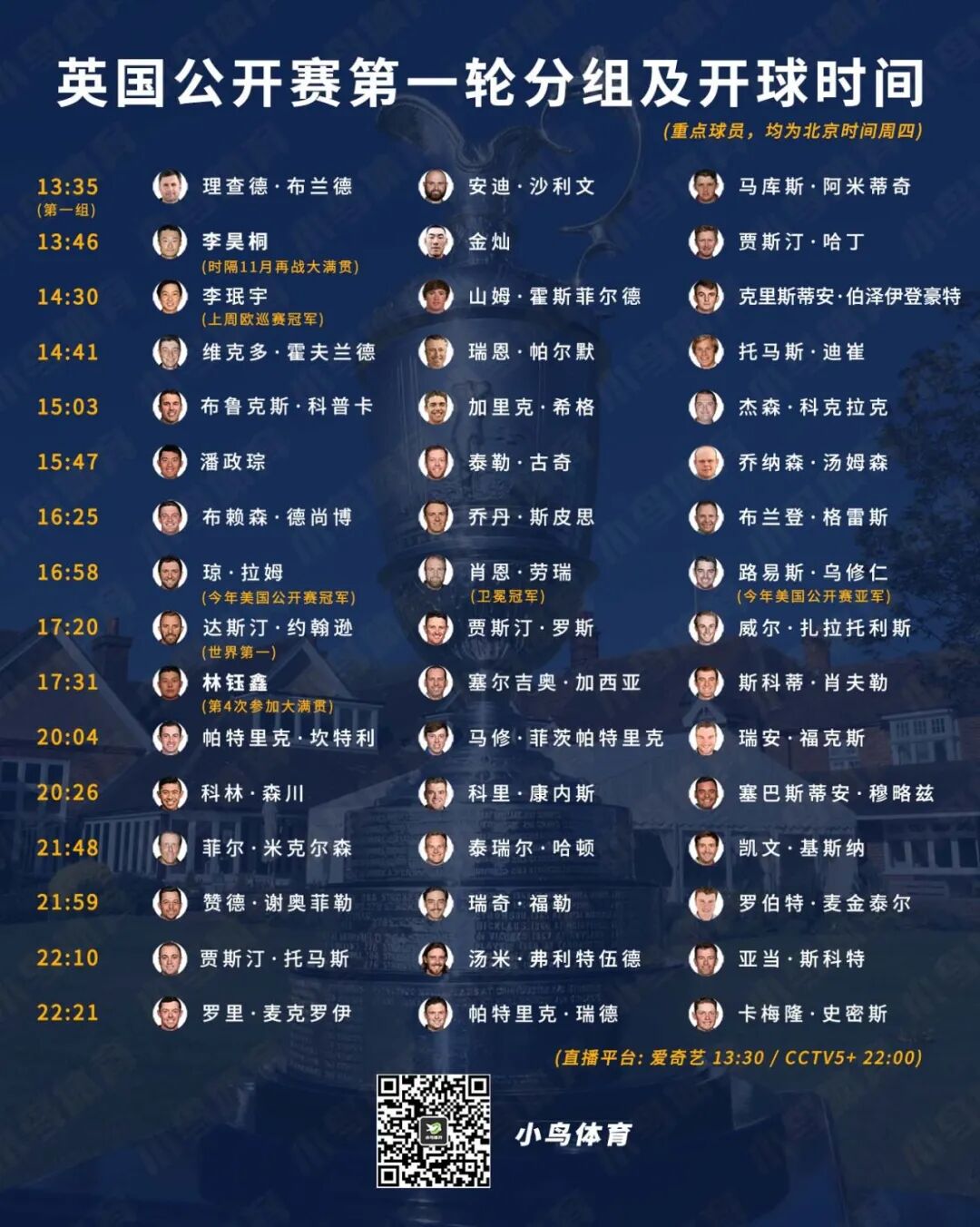 “那次比赛之前,我并没有打过真正意义上的林克斯球场。所以整体感觉真的十分特别。这一次,很开心能够回到林克斯,希望同样很享受,也能拥有美好的记忆。”时隔三年重返英国公开赛的他说。