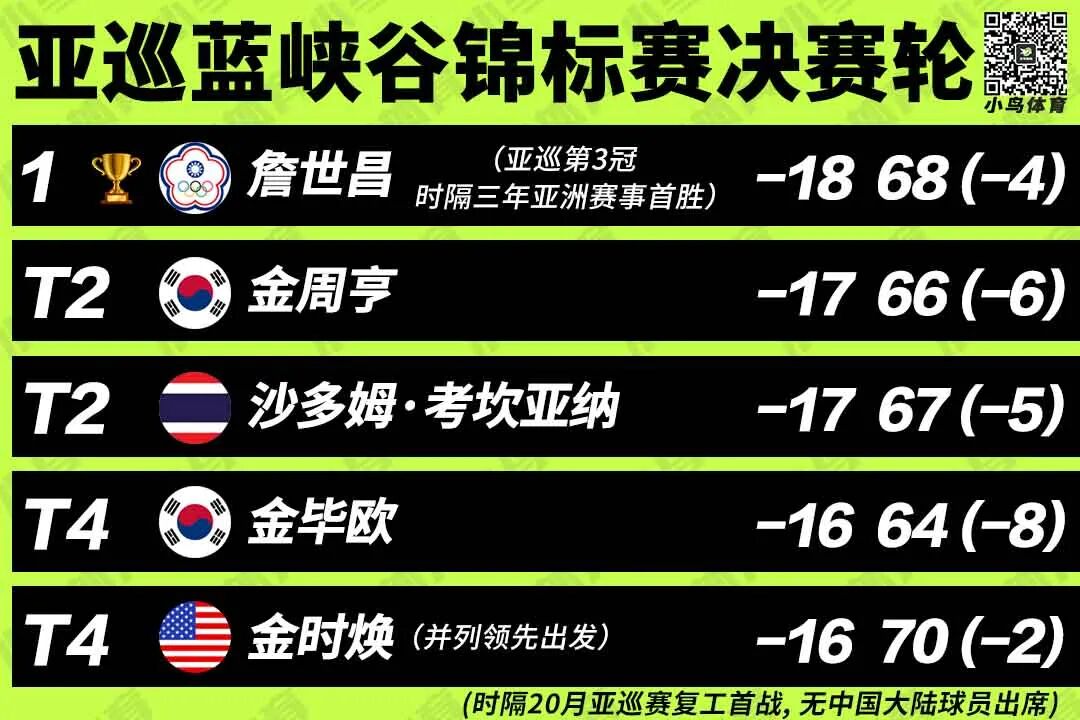 北京时间昨天下午,时隔20个月的首场亚巡赛——蓝峡谷锦标赛 (Blue Canyon Phuket Championship) 在泰国普吉岛的蓝峡谷乡村俱乐部结束四轮争夺。35岁的中华台北名将、前美巡中国赛冠军詹世昌力压群雄,以1杆优势勇夺个人第3座亚巡赛冠军。