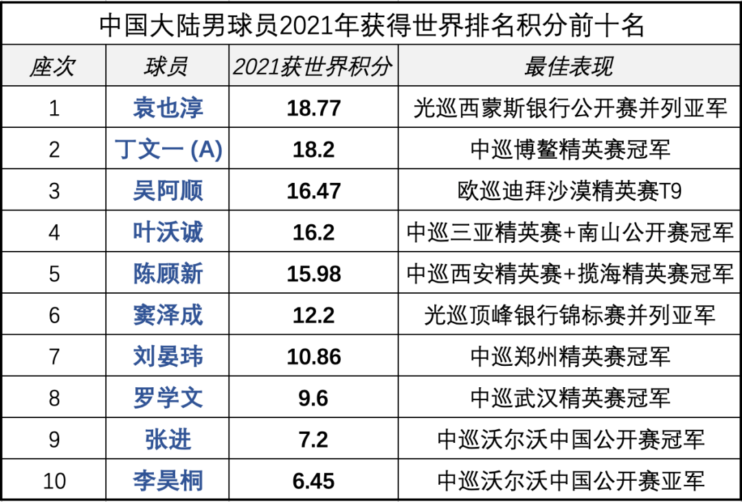 这也是为什么,上升幅度最大的中国男球手中,大都是些或职业新人、或复苏老将等“名不见经传”球手的身影;而在中国内地世界排名前十球员中,却仅有叶沃诚和陈顾新区区两人上榜。由于疫情,男子中巡赛在整个2020年只举办了两场,2021年却达到了9场——一旦一名球手在2020年表现欠佳,却又在2021年“复工之年”开始腾飞" (哪怕只打出一场好球) ,那么,他的排名自然会在过去一年大幅提升。就如同图表中的TOP10“飞马”球手,这些人的世界排名积分基本全是在2021年获得。因此,就算是2021年上升了572位的丁文一,也无法“与之匹敌”,更何况袁也淳、吴阿顺、李昊桐等过去一年艰难前行的头部球员了……![]()