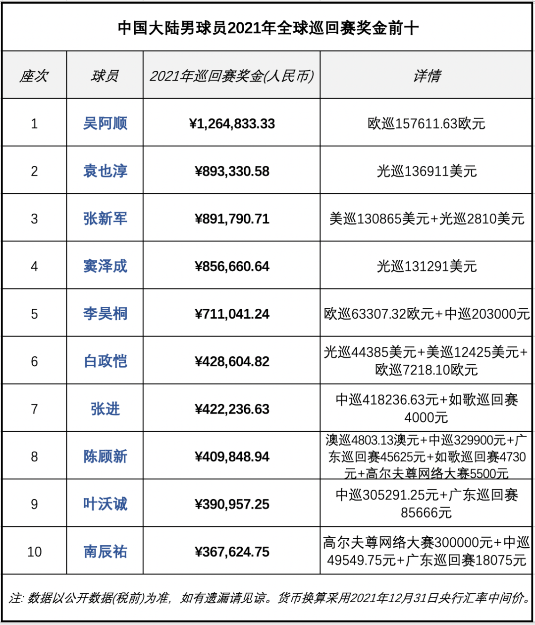 对于职业球员,世界排名积分固然宝贵,但毕竟不能当饭吃,最重要的,无疑是立命之本——奖金。如果我们盘点一下2021年,中国大陆男子球手各自累积的巡回赛奖金,又会得到如下的TOP10排名:主战场在欧巡赛的福建36岁老将吴阿顺,荣膺赛场吸金能力最强的“奖金王”!尽管2021年只有1场打进前十,他却依靠欧巡“常青树”的稳健发挥,成为唯一一位全年奖金超百万的中国大陆男球手。究其原因,主要有两点:1. 原先的中国一哥李昊桐,以及效力于美巡赛的张新军由于表现不佳,赛场吸金能力大幅缩水;2. 虽说袁也淳过去一年表现抢眼,其所在的光辉国际巡回赛场均70万美元的总奖金水平,比起站站百万欧元起跳的欧巡还是逊色不少,后者毕竟是全球仅次于美巡的一级巡回赛。袁也淳和吴阿顺过去一年分别晋级9场和10场,尽管前者奉上4场前十之作,世界排名也力压前辈,场均收入却只有9.9万元人民币,比起吴阿顺的场均12.6万元只能望尘莫及。