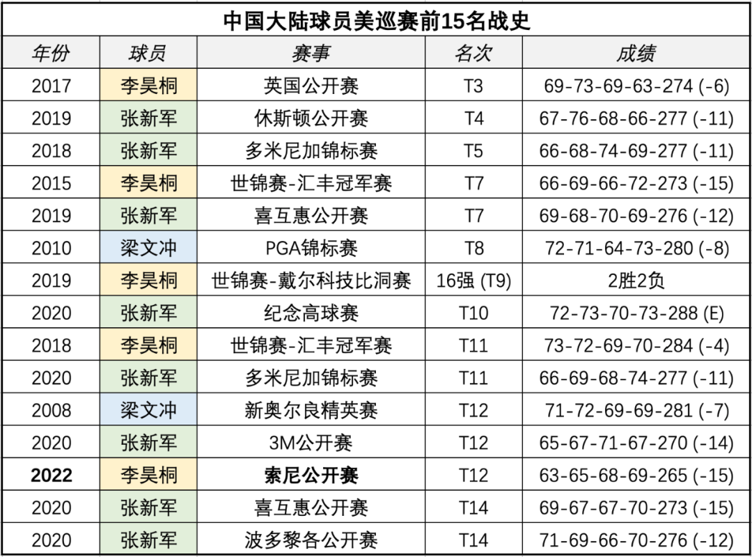 何况,上周的李昊桐,几乎将一张外卡的机会充分利用到了极限——总共10位赞助商外卡受邀球员中,他最终成绩排名第一;而并列第12名,不仅创下了十四年来中国球员在索尼公开赛上的最佳战绩,也追平了中国大陆球员通过外卡参加美巡赛的历史最好排名 (2008新奥尔良精英赛/梁文冲/T12) 。四轮比赛,李昊桐总共抓下了22只小鸟!更是在全场144名球员中高居第5,只比最终夺冠的松山英树少打4鸟。