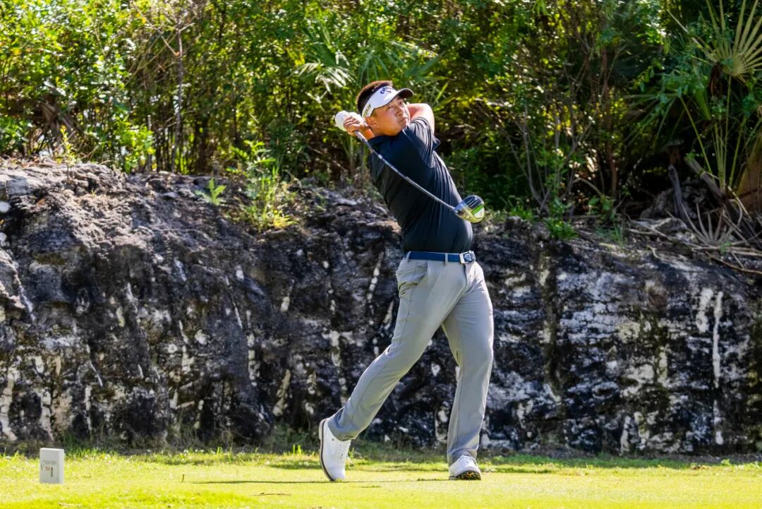 这是2022赛季光辉国际巡回赛首役,大埃克苏马精英赛决赛轮的领先组,袁也淳在前9洞抓下3只小鸟之后,跃居单独领先,并已手握了2杆优势!只要他能在巴哈马的海风中挺过后九洞,就能斩获加入美巡二级赛三年来的首座桂冠。