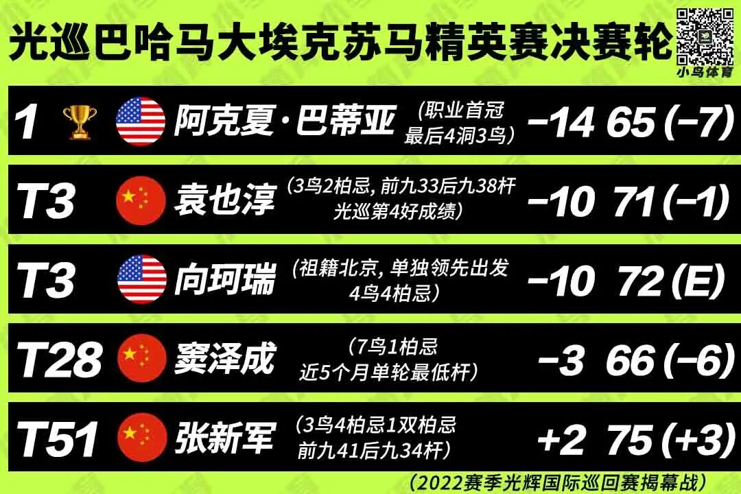 可惜近情情怯,中国一哥的攻击火力,关键时刻却突然哑火,11号洞和13号洞,全场最后两个三杆洞,他还接连出现了失误,两度掉杆,由此将冲击首冠的旌旗,拱手让给了19岁的美籍印度裔新星阿克夏·巴蒂亚 (Akshay Bhatia) ——后者最后4洞狂砍3记小鸟,风云突变之中后来居上,逆袭赢走这场光巡揭幕战的最终冠军。