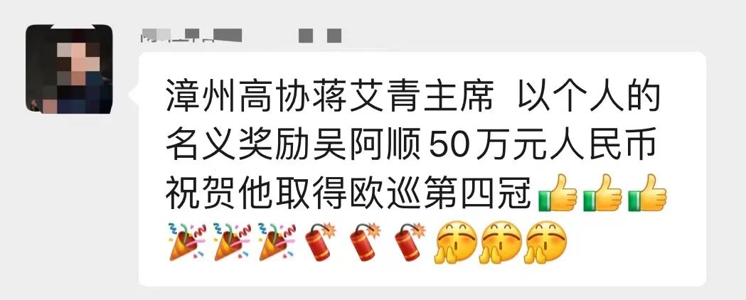 而根据小鸟体育粉丝群友的“爆料”,吴阿顺出生地漳州市高尔夫球协会的蒋艾青主席,据悉还会以个人名义,奖励吴阿顺50万元人民币 (此消息未经进一步证实,仅供参考)。