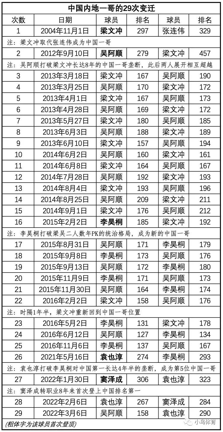 肯尼亚公开赛的冠军世界排名积分高达24分,相当于4场中巡赛冠军的量级——这意味着,吴阿顺的世界排名将从赛前的第342位,飙升至第158位——并且从中国大陆第4的位置,一跃反超“一哥”袁也淳,登上中国大陆男子排名第一!这是自从2016年11月6日以来,吴阿顺时隔5年零4个月,再次重返“中国一哥”宝座,也是历史上这一位置第29次发生易主。