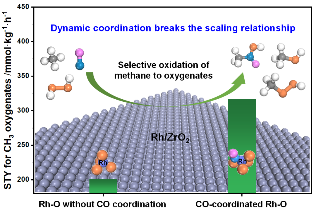 论文链接:https://doi.org/10.1016/j.jcat.2022.10.012甲烷低温直接转化为高附加值的含氧化合物产品对于甲烷的高效利用具有重要意义。然而,甲烷直接催化转化往往受限于催化活性与选择性的Trade-off效应,即具有低甲烷活化能垒的催化剂也通常对目标产物的过度氧化具有低的活化能垒,反之亦然。这就如跷跷板两端一样致使很难同时实现甲烷催化转化的高活性与目标产物的高选择性。如何突破甲烷低温直接氧化的Trade-off效应,实现既能显著促进甲烷活化又能有效抑制目标产物过度氧化是当前甲烷催化转化研究中的一个巨大挑战。调控催化活性中心的配位环境是提高催化性能的有效手段。然而,目前文献报道主要聚焦在“金属活性中心-载体”之间的配位结构和相互作用,如调变金属活性位与载体的几何结构和配位数、金属-载体化学成键强度(SMSI作用),或双(多)活性中心的协同催化作用等。在本项工作中,江南大学刘小浩团队试图通过反应过程中引入“反应物(或中间物种)-金属活性位”的配位结构和电子性质的动态变化来实现甲烷可控催化转化的突破。基于系统的理论计算和实验研究发现:在原子分散的Rh/ZrO2催化甲烷低温转化的反应中引入CO能有效突破甲烷转化的Trade-off效应,反应过程中形成的CO-Rh-O配位结构不仅促进了甲烷活化和转化,同时提高了中间物种*CH3过度氧化的能垒,这样实现了甲烷转化活性的大幅提升和过度氧化的有效抑制(图1)。![]()