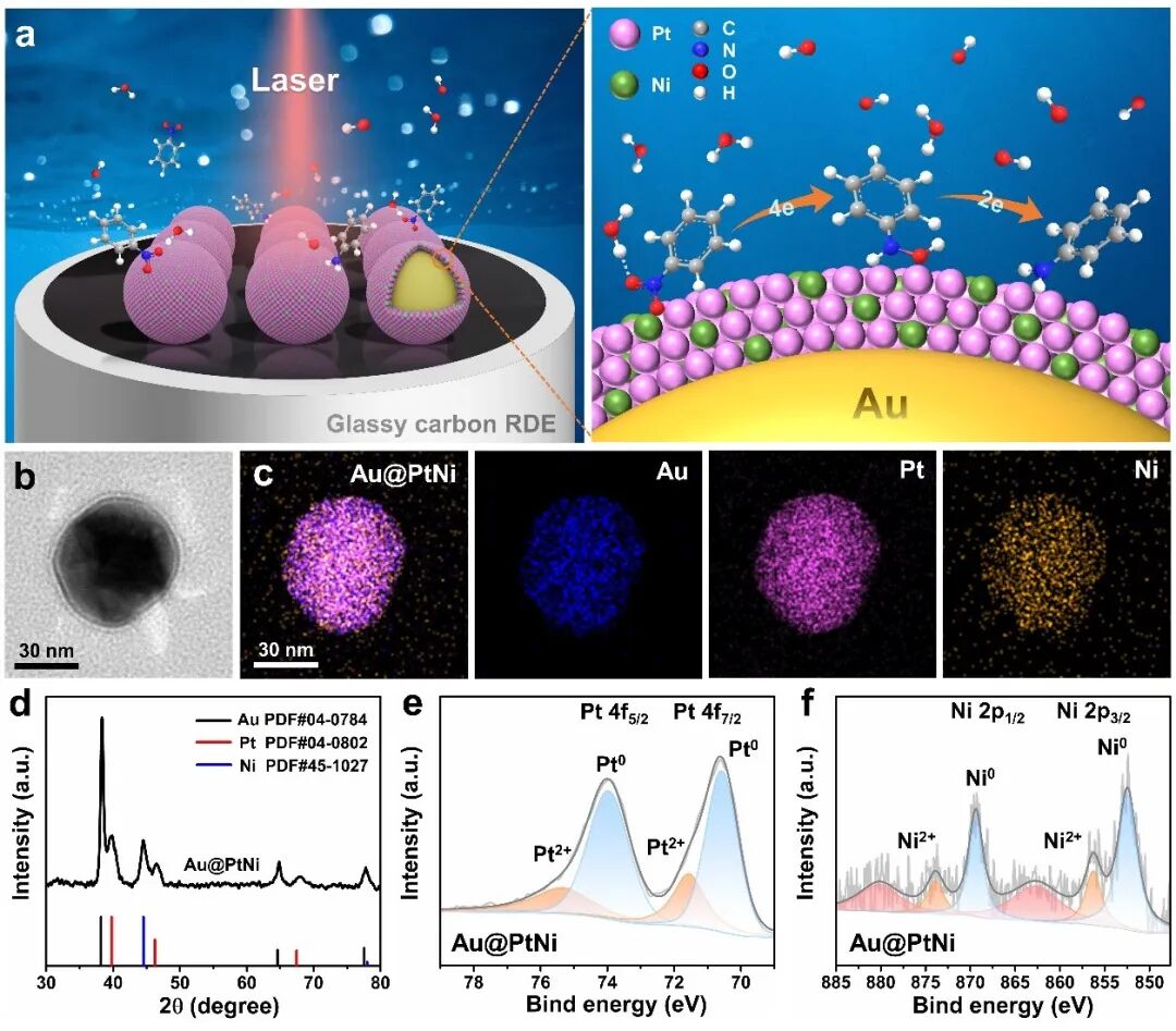 图1 硝基苯在Pt(111)和PtNi合金表面加氢还原为苯胺的自由能变化然后作者采用“借用”策略制备了Au@PtNi纳米粒子作为原位表面增强拉曼与旋转圆盘电极联用的双功能催化剂,透射电镜等表征结果证实了无针孔核壳纳米粒子的成功制备。![]()