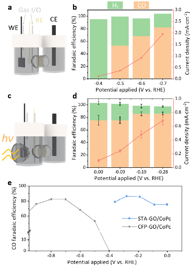图3. (a) 电化学 H 电池示意图。标签显示工作电极 (WE)、对电极 (CE)、参比电极(RE) 和气体进/出端口。(b) 在不同应用电位下,CFP-GO/CoPc 的 CO、H2的FE 和电流密度。(c) 具有石英窗和侧面照明的 PEC H 电池示意图。(d) STA-GO/CoPc在1.5太阳光照、不同外加电位下,CO、H2的FE和电流密度。(e) STA-GO/CoPc(PEC CO2 还原)和CFP-GO/CoPc(电化学 CO2 还原)之间的 CO 选择性比较。![]()