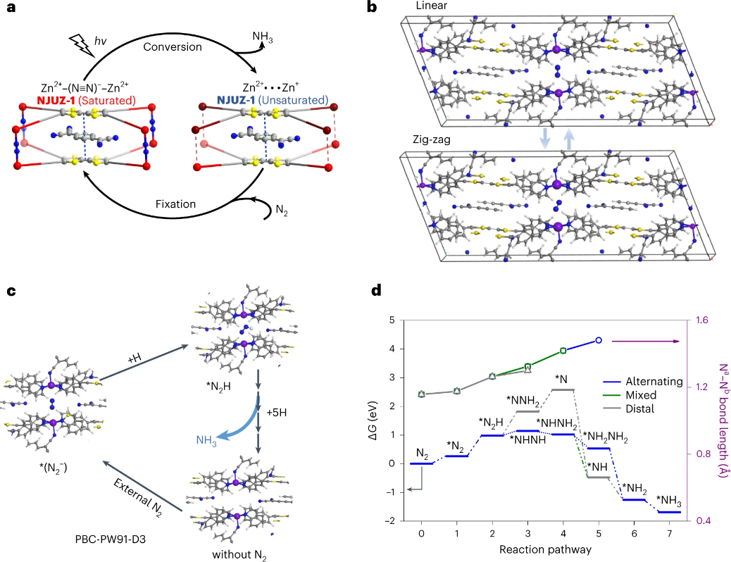 NJUZ-1 可能的 NRR 途径。a,NJUZ-1在光催化NRR过程中的循环过程示意图。b,在使用 PBC 的DFT/PW91-D3 计算中,线性和锯齿形几何形状在能量上彼此接近。c,所提出的NJUZ-1催化的 NRR 过程反应途径示意图。d,在不同潜在途径的每一步中,计算的自由能(ΔG)和N1-N2键长的变化。![]()