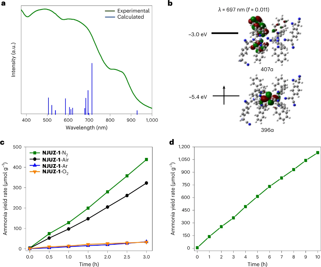 图3. NJUZ-1的吸收特性和NRR性能。a,NJUZ-1的紫外-可见吸收光谱。b,TDDFT 计算的团簇 A 的轨道能级。结构中原子的颜色:Zn,紫色;N, 蓝色; C、灰色;H,白色。c,NJUZ-1 在N2、未净化空气、Ar 或 O2 饱和的去离子水中的总氨产率。每个实验至少独立重复三次,同一样品的结果相似,并显示了代表性数据。d,N2 流量下NRR 的 10小时长期稳定性测试。每个实验至少独立重复三次,同一样品的结果相似,并显示了代表性数据。![]()