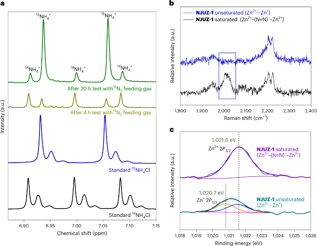NJUZ-1 在 NRR 过程中和之后的表征。a, 在不同测试持续时间后用15N2 进料气体在NJUZ-1 获得的产物以及14NH4Cl 和 15NH4Cl 标准样品的 1H NMR 谱图。b,在原始状态(饱和)和NRR过程(不饱和)后测量的NJUZ-1的拉曼光谱,表明在几个光催化反应循环后NJUZ-1的二氮阴离子消失。c,在原始状态(饱和)和 NRR 过程后(不饱和)测量的 NJUZ-1 的 XPS 光谱,表明在 NRR 过程后有一半的 Zn2+ 物种转化为 Zn+ 物种。![]()