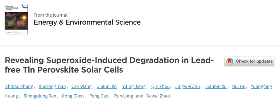 目前,锡基钙钛矿材料在光电应用领域已显示出巨大的潜力。与铅基钙钛矿材料相比,其不仅具有较轻的生物毒性,而且具有同样优异的光电性能,包括更窄的带隙和更高的载流子迁移率。基于此,锡基钙钛矿电池的光电转换效率目前已经突破14%。锡基钙钛矿最严重的问题在于其更容易受到氧气的影响(Sn2+易被氧化为Sn4+),这一缺点虽然已引起广泛的研究,然而它们在同时光照和氧气暴露的条件下的稳定性尚待探索。一般来讲,氧气分子可以扩散到钙钛矿晶格中,在光照下接受来自钙钛矿的光激发电子以形成超氧离子,该活性超氧离子(O2-)可以通过破坏钙钛矿ABX3结构中的B-X键使得钙钛矿的有机阳离子去质子化,从而导致钙钛矿材料发生降解。从超氧离子形成的原理和最常用的锡基钙钛矿的成分(FASnI3中的有机阳离子FA+)来看,在光氧气暴露的环境下,超氧离子诱导的降解过程很可能发生。另一方面,虽然封装被普遍应用,可以在很大程度上防止氧气扩散到锡基钙钛矿器件中。然而,少量氧气仍然可能存在于玻璃衬底和覆盖玻璃之间的间隙中,或者在器件运行过程中由于封装胶老化而发生缓慢的氧气泄入。到目前为止,缺少关于超氧离子对锡基钙钛矿的光氧稳定性的潜在影响研究,其潜在机制尚不清楚。同时,若锡基钙钛矿中存在超氧离子引起的降解过程,则应制定相应的应对策略,以提高锡基钙钛矿电池的光氧稳定性。![]()