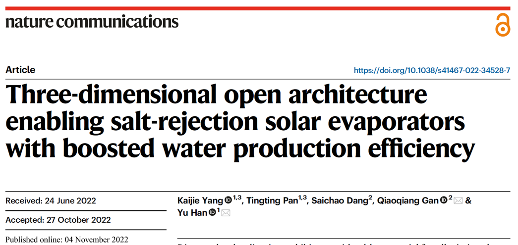 1.提出了一种新型的蒸发器结构,通过传质桥与开放式三维架构设计,在实现高效抗盐的同时抑制了传导热的损失。该蒸发器可在高浓度盐水(如:12-14 wt% NaCl溶液,RO系统排放废水)中稳定运行,在一个太阳的光照条件下,蒸发效率达1.64 kg/m2。2.户外实验证实,放大后的蒸发器可在自然光下稳定运行,日产水量达5 L/m2,实际太阳能集水效率达>40%,每平方米蒸发器可满足至少两人的日常饮用水需求。