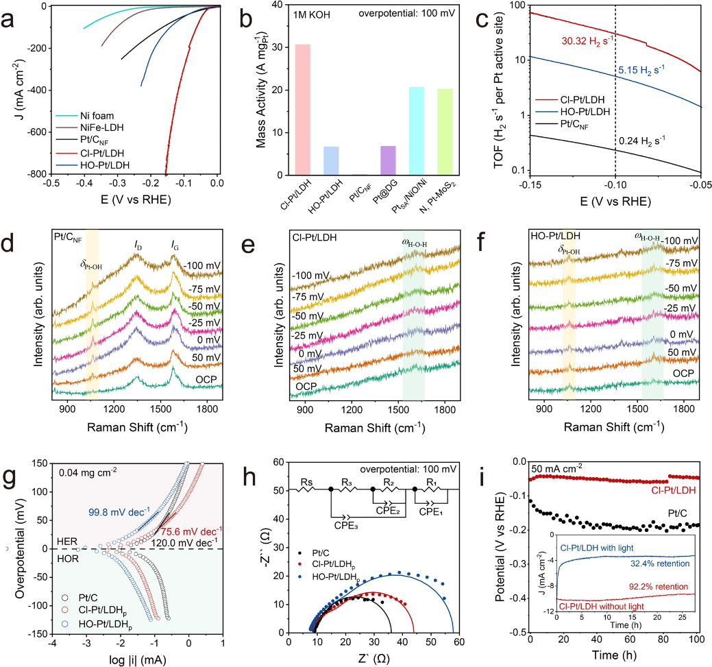 Pt 基催化剂的 TOFs 图。d Pt/CNF、e Cl-Pt/LDH 和 f HO-Pt/LDH 的原位拉曼光谱。g Pt/C、Cl-Pt/LDHp 和 HO-Pt/LDHp 的微极化曲线。h Pt 基催化剂的 EIS Nyquist 图。i 在50 mA cm-2 的恒定阴极电流密度下,Cl-Pt/LDH 和商业 Pt/C 的电位-时间图(插图为有或无光照条件下,Cl-Pt/LDH的计时电流稳定性测试)。![]()