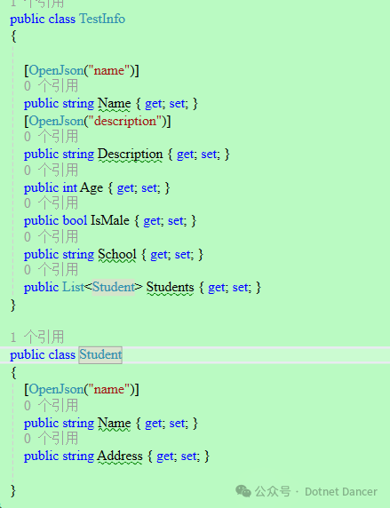 使用方式:引用上面的1.0.10版本或以上的包。如果实体类有特殊需求,例如映射为其他名称,可以用OpenJson属性来实现。实体类对象案例如下: