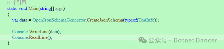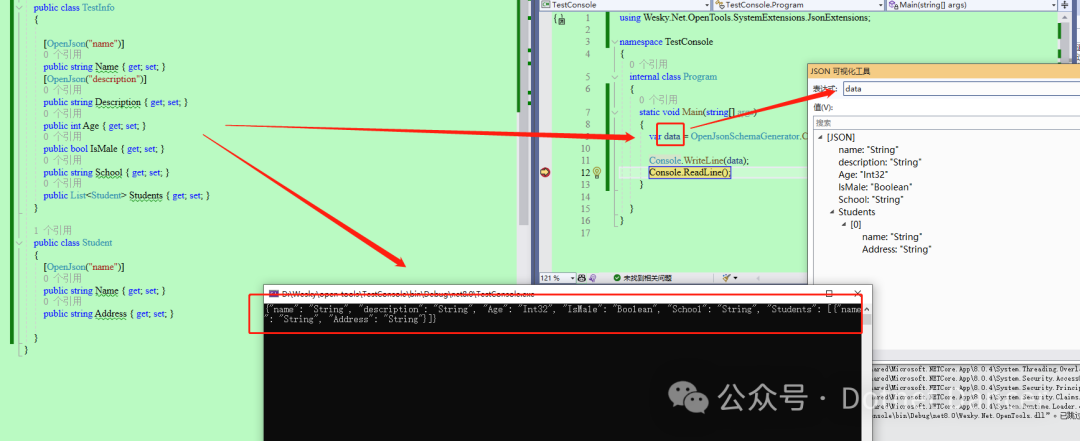 public class TestInfo{[]public string Name { get; set; }[]public string Description { get; set; }public int Age { get; set; }public bool IsMale { get; set; }public string School { get; set; }public List<Student> Students { get; set; }}public class Student{[]public string Name { get; set; }public string Address { get; set; }}// Program:static void Main(string[] args){var data = OpenJsonSchemaGenerator.CreateJsonSchema(typeof(TestInfo));Console.WriteLine(data);Console.ReadLine();}