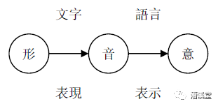 因為西方語言學是通過拉丁字母文字研究和描寫語言。西方語言學認為語音的最小單位是音素,字母是音素的符號,文字是語言的符號,拉丁字母文字表現語言,拉丁字母文字是表音文字,表音文字是先進的文字,表意文字是落後的文字。中國語言學家接受了西方語言學的文字觀,呂叔湘認為“代表語言,也就是能讀出來,這是文字的本質。”[14]徐通鏘認為“文字是用‘形’通過‘音’來表示‘意’的。”[15]如下圖: