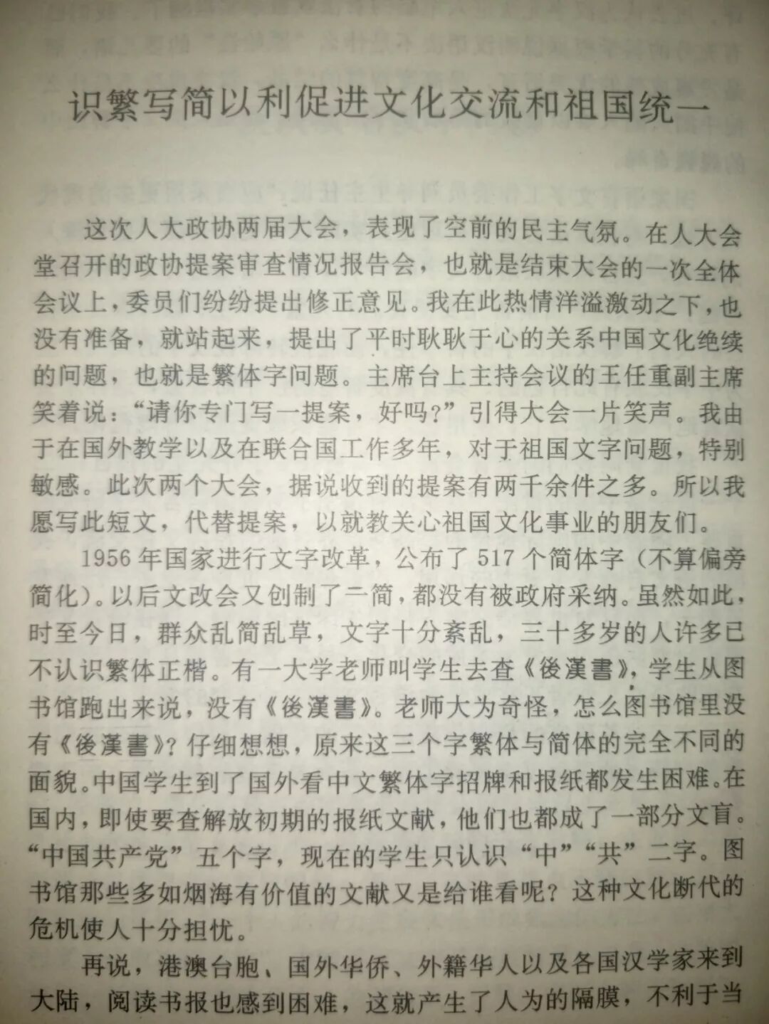 这次人大政协两届大会,表现了空前的民主气氛。在人大会堂召开的政协提案审查情况报告会,也就是结束大会的一次全体会议上,委员们纷纷提出修正意见。我在此热情洋溢激动之下,也没有准备,就站起来,提出了平时耿耿于心的关系中国文化绝续的问题,也就是繁体字问题。主席台上主持会议的王任重副主席笑着说:“请你专门写一提案,好吗?”引得大会一片笑声。我由于在国外教学以及在联合国工作多年,对于祖国文字问题,特别敏感。此次两个大会,据说收到的提案有两千余件之多。所以我愿写此短文,代替提案,以就教关心祖国文化事业的朋友们。