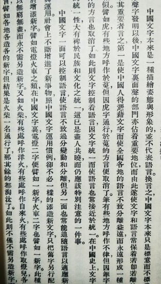 中国文字本来是一种描绘姿态与形象的,并不代表语言。换言之,中国文字本来只是标意而不标音。但自形声字发明以后,中国文字里面声的部门亦占着重要地位,而由此遂使文字和语言常保着若即若离的关系。举其重要者言之,第一是使中国人得凭藉文字而使全国各地的语言不致分离益远,而永远形成一种亲密的相似。譬如虎,有些地方呼作於菟,但因虎字通行,於菟的方言便取消了。笔,有些地方呼作不律,但因笔字通行,不律的方言也取消了。如此则文字控制着语言,因文字统一而使语言也常接近于统一。在中国史上,文字和语言的统一性,大有裨于民族和文化之统一。……