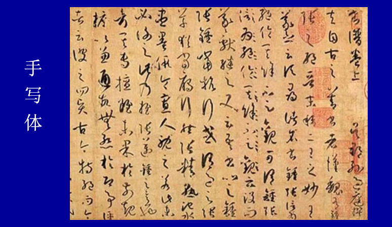 宋体和楷书是印刷体,行书和草书是手写体。用于“识”的书籍是机器印刷的,是可以规范的,个人书写很难规范,于是古人只把书上的印刷体作为规范字体,个人可书写不规范的手写体。这样就解决了“识字”读书和“书写”难的问题。中国古人是区分汉字的“识”和“写”的。今天又出现了新的呈现字形的方式,这就是用电脑打字。